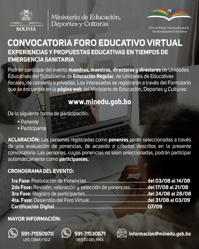 El Ministerio de Educación, Deportes y Culturas a través del Instituto de Investigaciones Pedagógicas, invitan a maestros y directores de unidades educativas del subsistema regular al foro de experiencias y propuestas educativas en tiempos de Covid-19. El Foro Virtual, será un espacio de intercambio, reflexión y análisis de propuestas educativas construidas en el marco de la emergencia […]