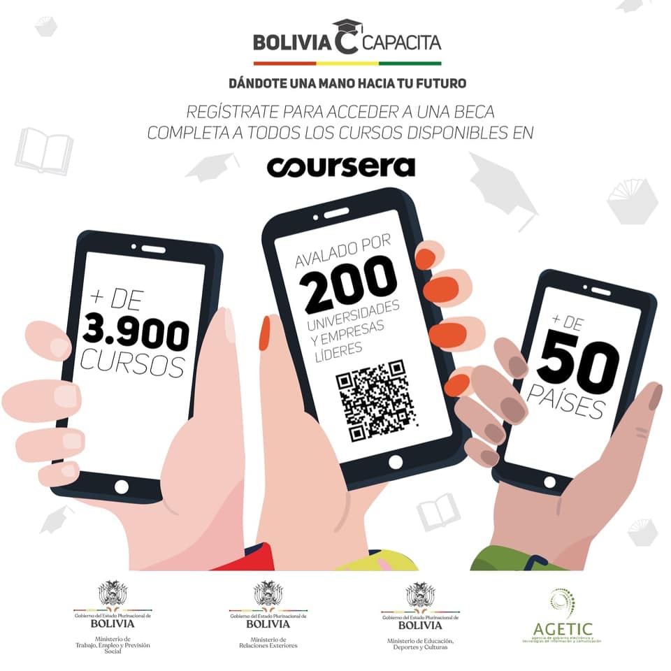 Dándote una mano hacia tu futuroLanzamiento de la plataforma que beneficiará a 10.000 bolivianos en su formación académica para la modernización educativa para el presente y el futuro. Ingresa al link https://solicitudbecascoursera.agetic.gob.bo/…